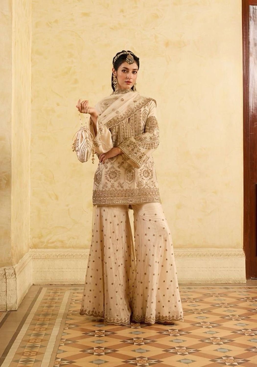 Fabric Type | Top:Chinon silk , Inner : Micro , Work : thread with sequence Palazzo : Chinon silk thread with Sequence , Stitch:- Full stitch up to 44 with elastic Dupatta : Organza silk thread with Sequence with with Fourside cutwork border , Length : 2.2 meter |