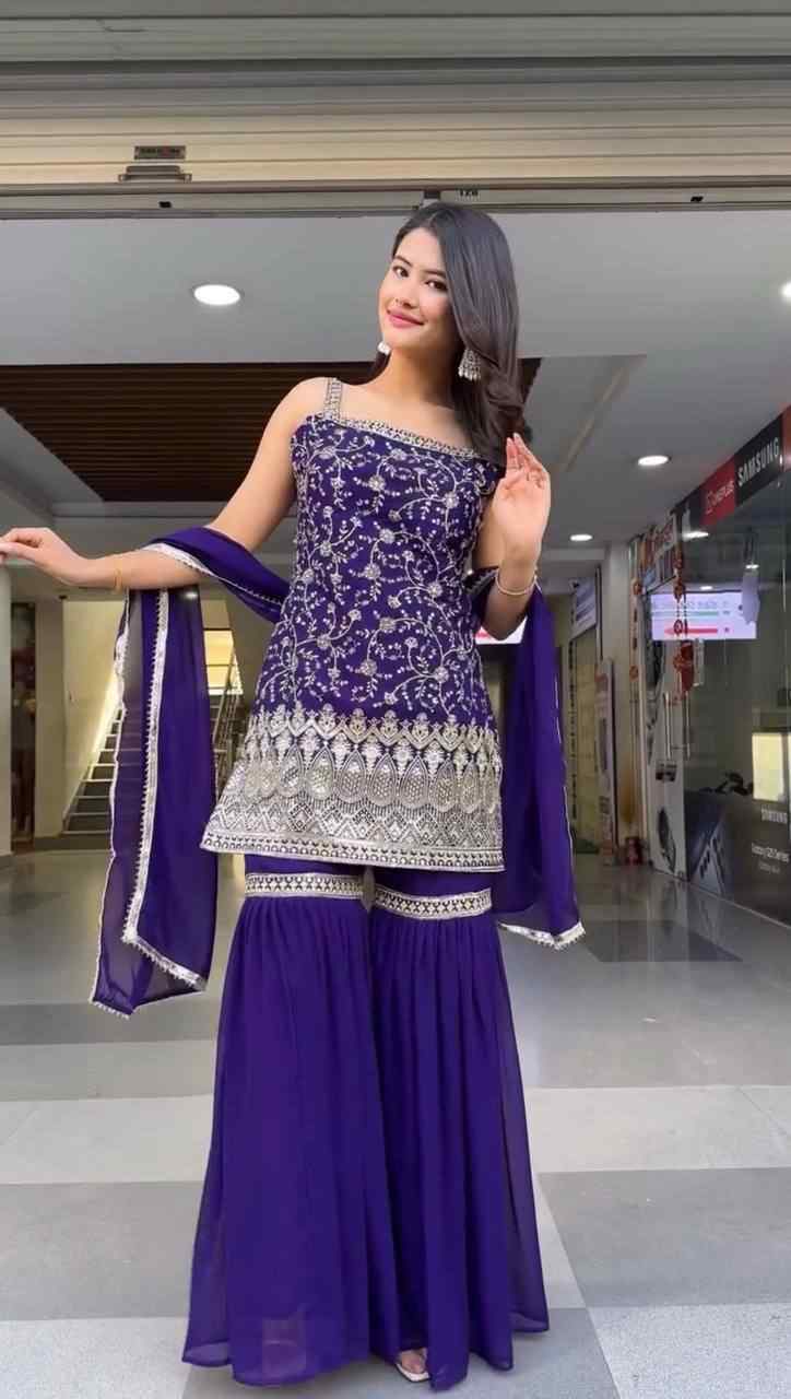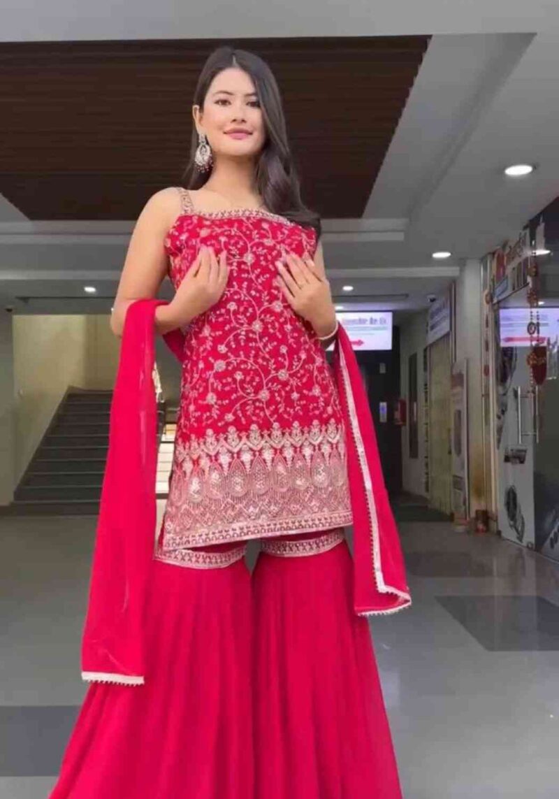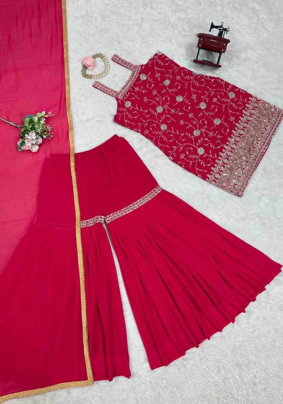 Fabric Type | Top: Faux Georgette And Thread with Sequence Work ,Inner : Micro , Sharara: Faux Georgette And thread with Sequence Work And Full stitch upto 44 with elastic, Dupatta : Faux Georgette Thread with Sequence Work with Fourside lace border, Length : 2.2 meter |