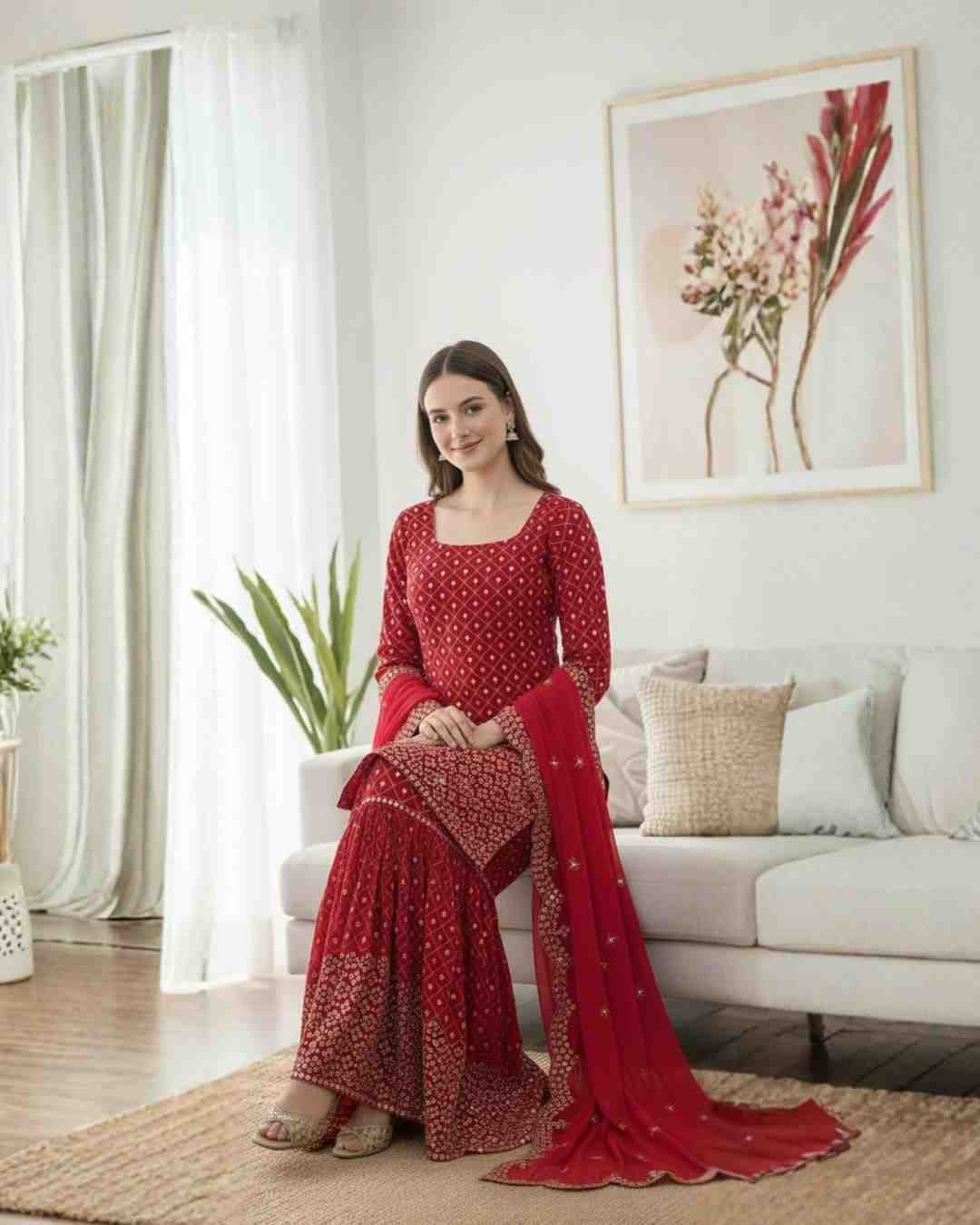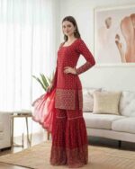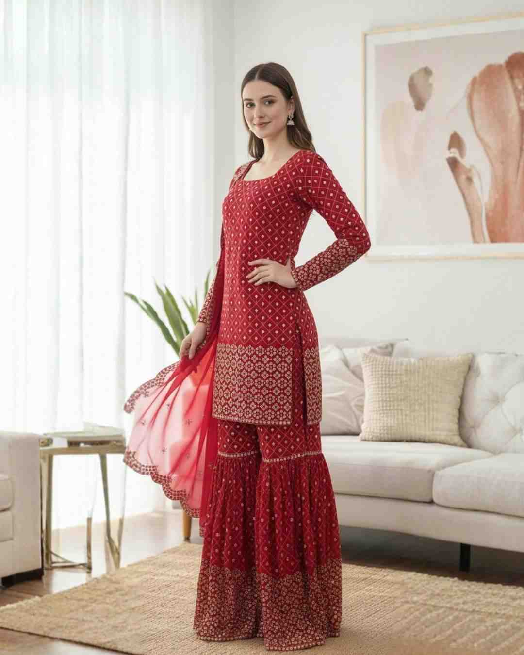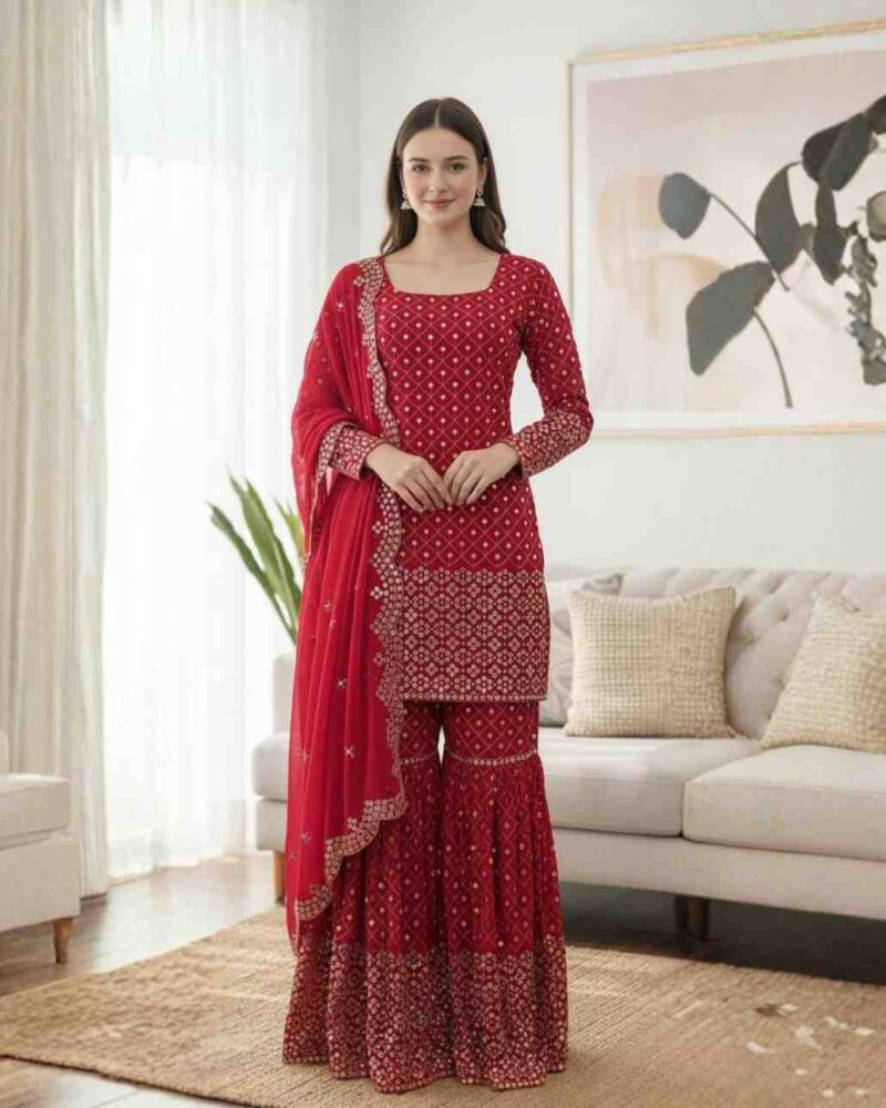 Fabric Type | Top: Faux Georgette With Thread And 9 mm Sequence Work , Top Inner : Micro Cotton, Length : 40 inch Shrara : Faux Georgette , Full Stitched With Elastic , Length:38 inches Dupatta : Faux Georgette With Thread with sequence with 4-Side lace border work ,Length: 2.2 meters |