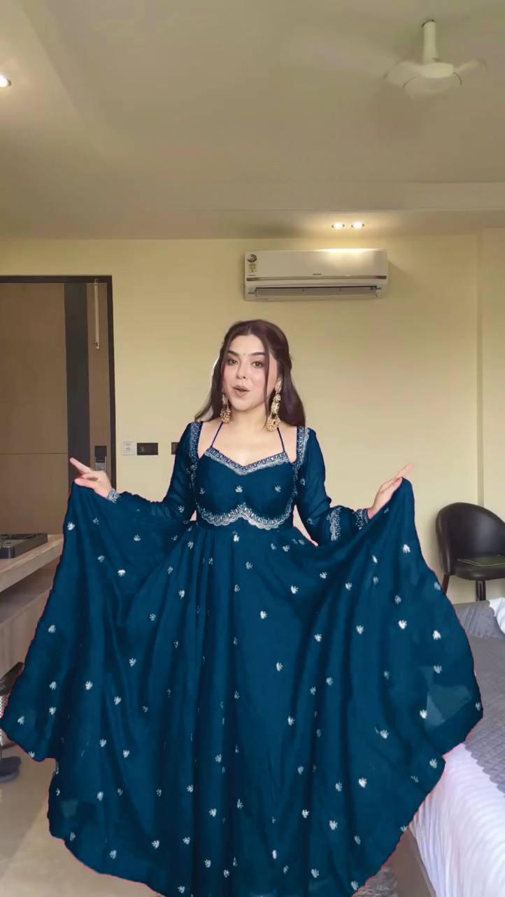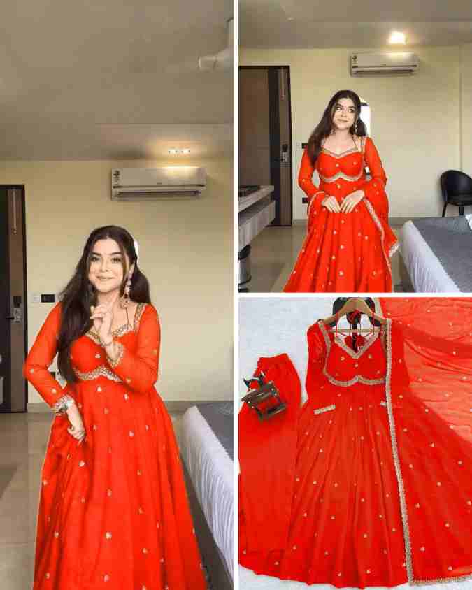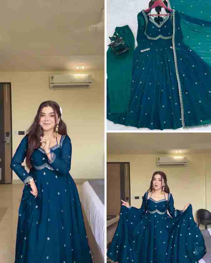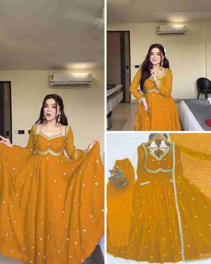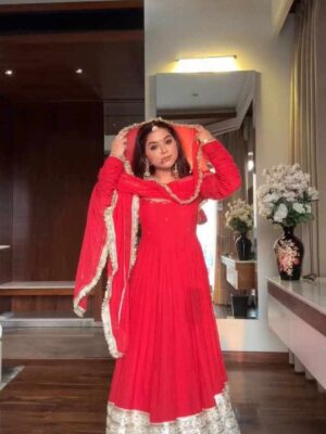 Fabric Type | Gown:Faux Georgette With Thread And Sequence Work , Top Inner :Soft Micro Cotton , Length : 52 inch , Flair : 4 mtr. Bottom:Micro Cotton, Full Stitched With Elastic , Length : 38 inch Dupatta: Faux Georgette With Thread with sequence with 4-Side Lace Border Work , Length: 2.2 meters. |