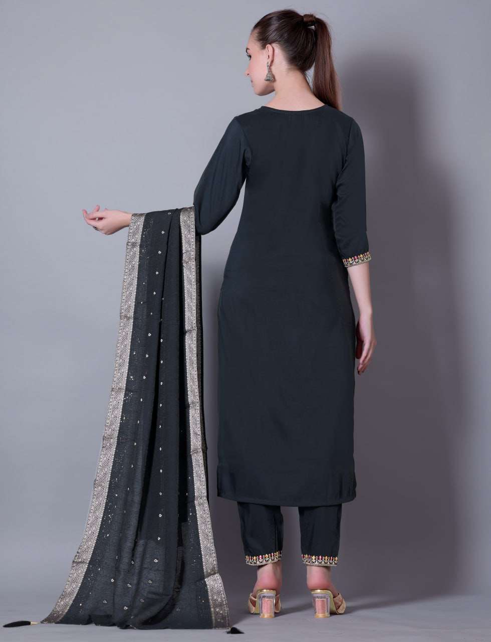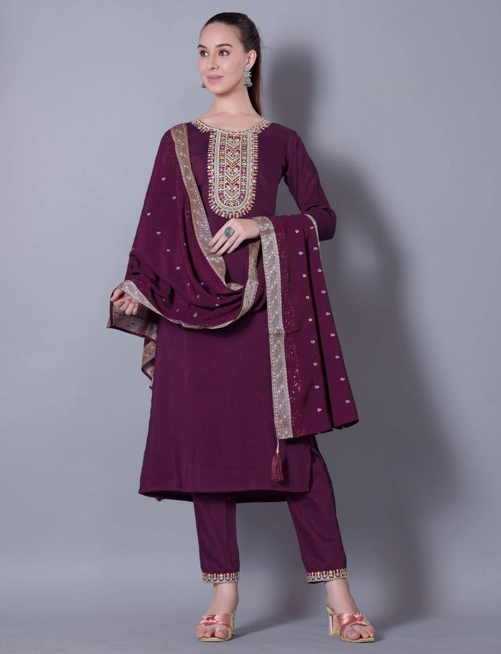 Fabric Type | Kurti : Silk Blend, Work : Embroidery, Sleeve Length : Three -Quarter Sleeve , Length : 46 Inch , Inner : Micro Bottom : Silk Blend ,Work : Embroidery , Length :38 inch Dupatta : Jacquard , Work : Embroidery, Length : 2.15 mtr. |