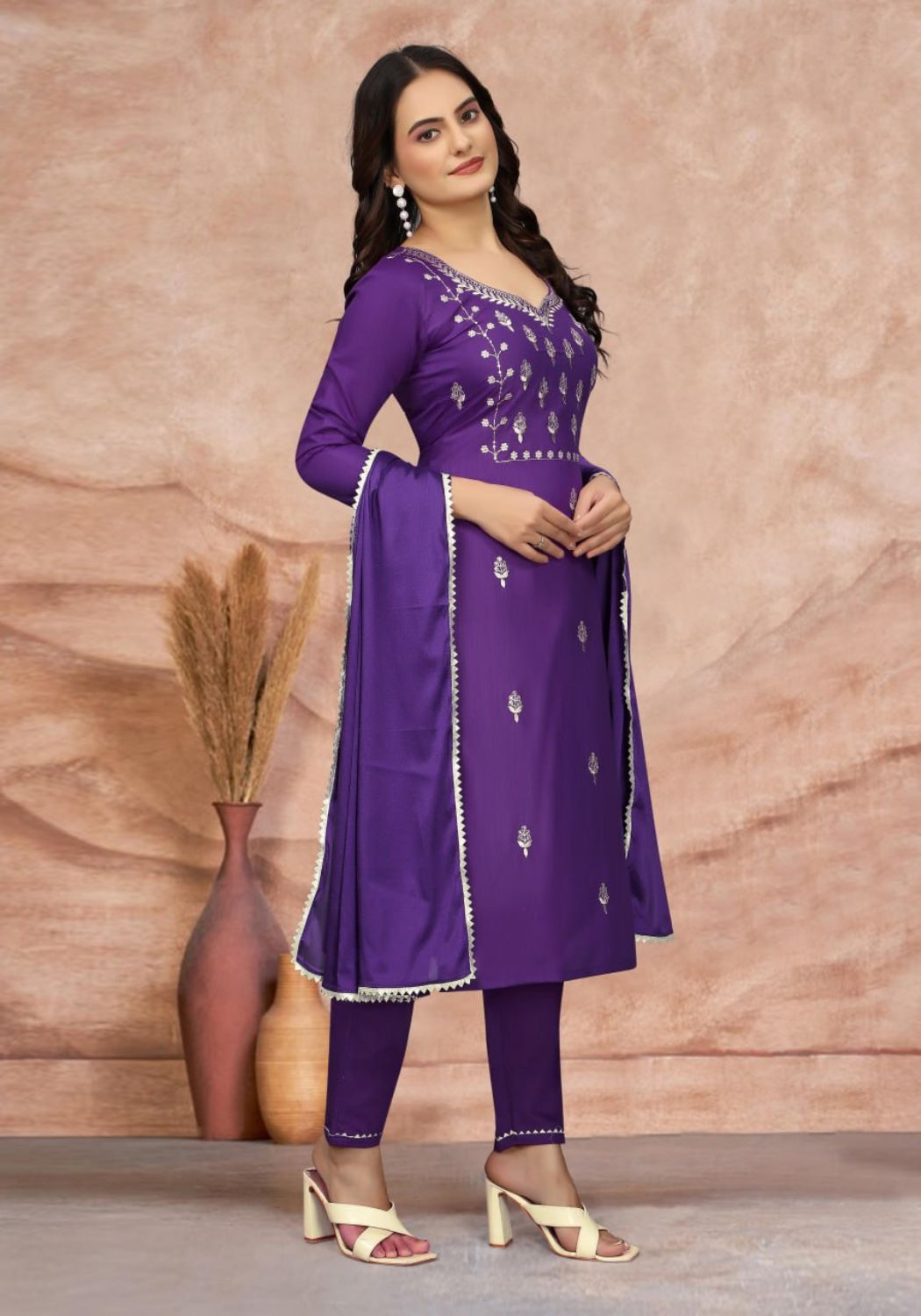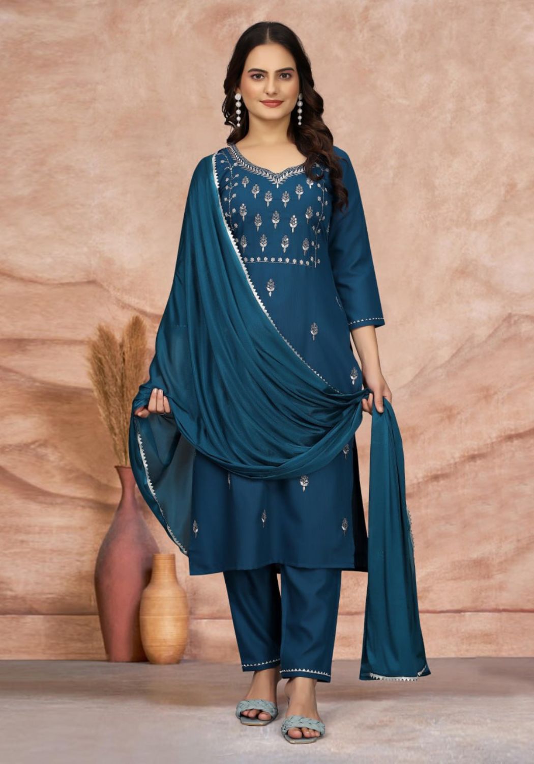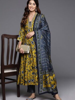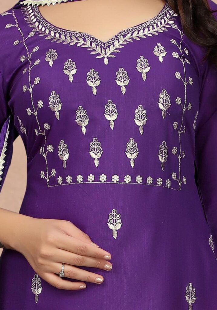 Fabric Detail | Kurta Fabric :- Cotton Blend | Bottom Fabric :- Cotton Blend | Dupatta Fabric :- Silk | Sleeve Length – Three-Quarter Sleeve |