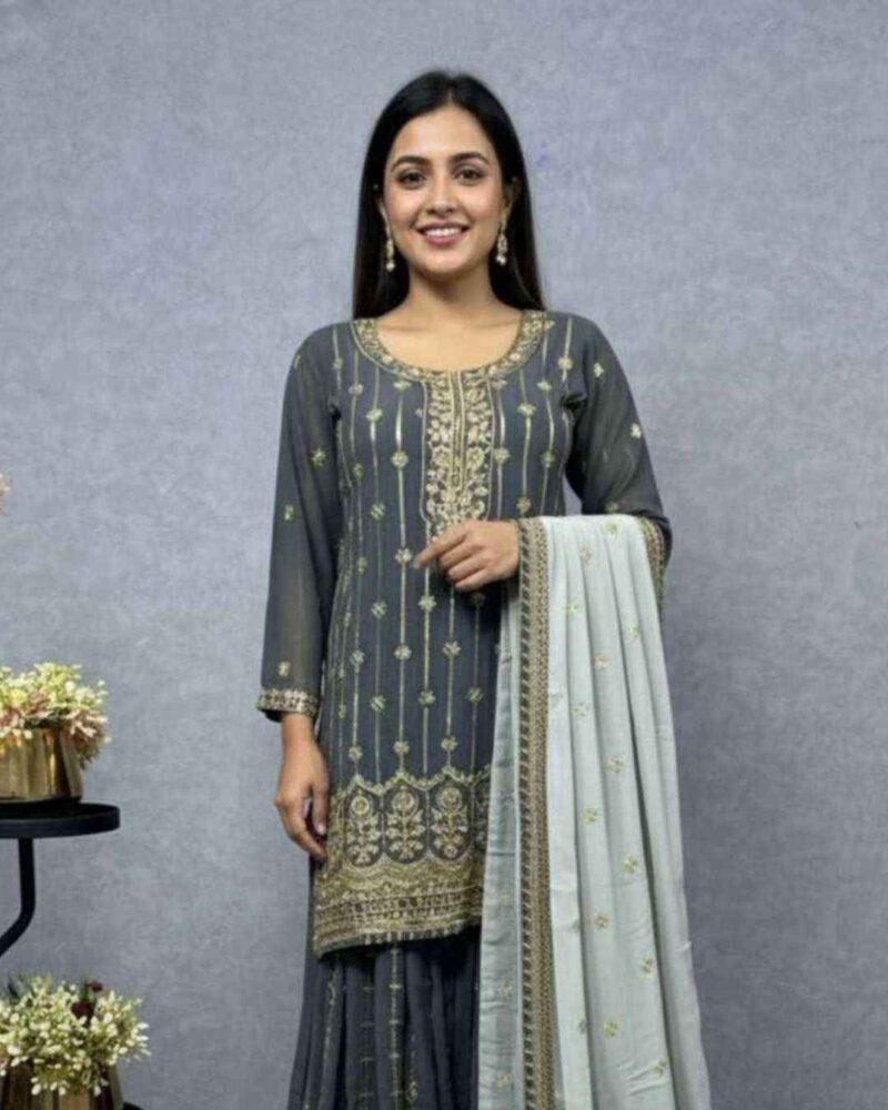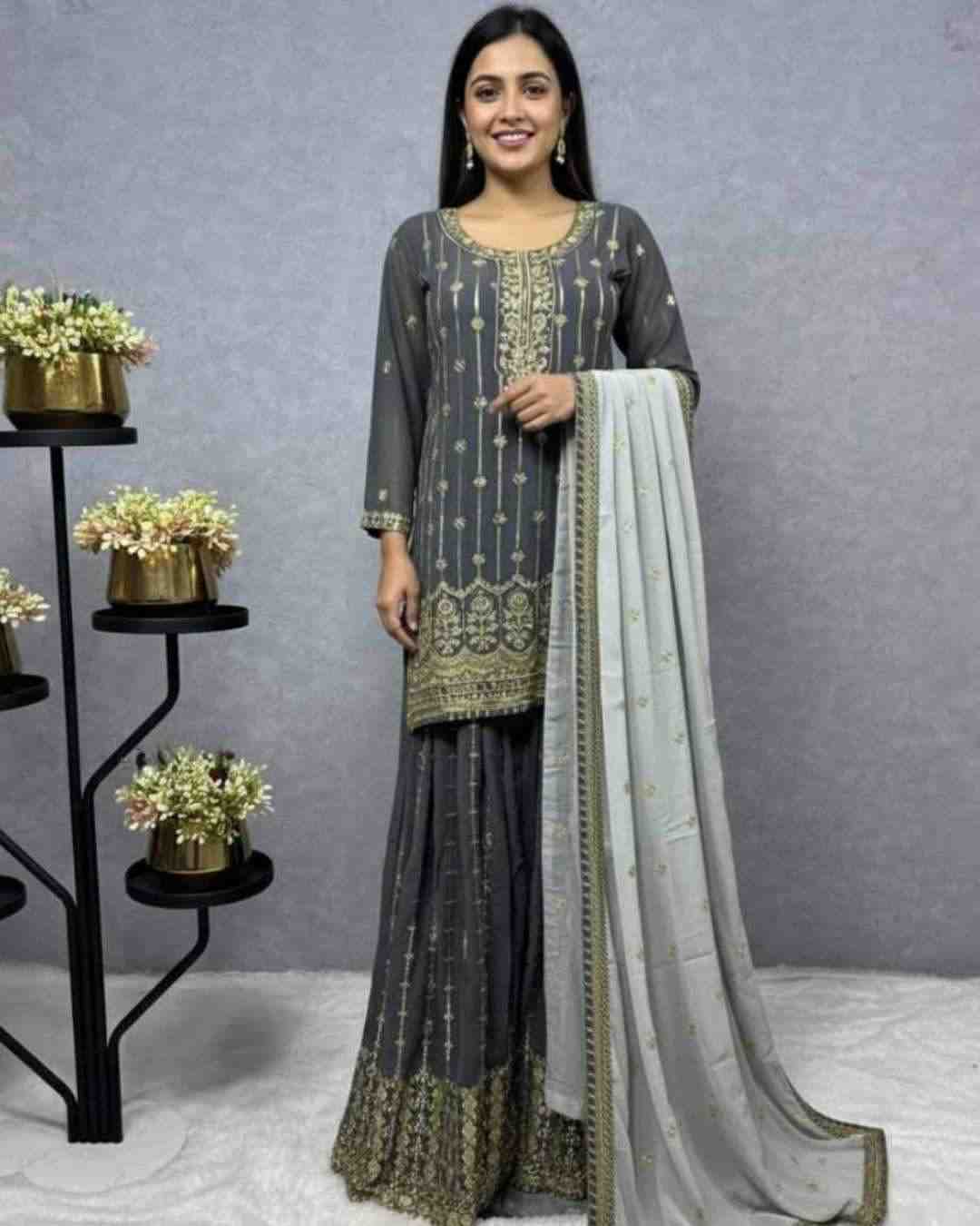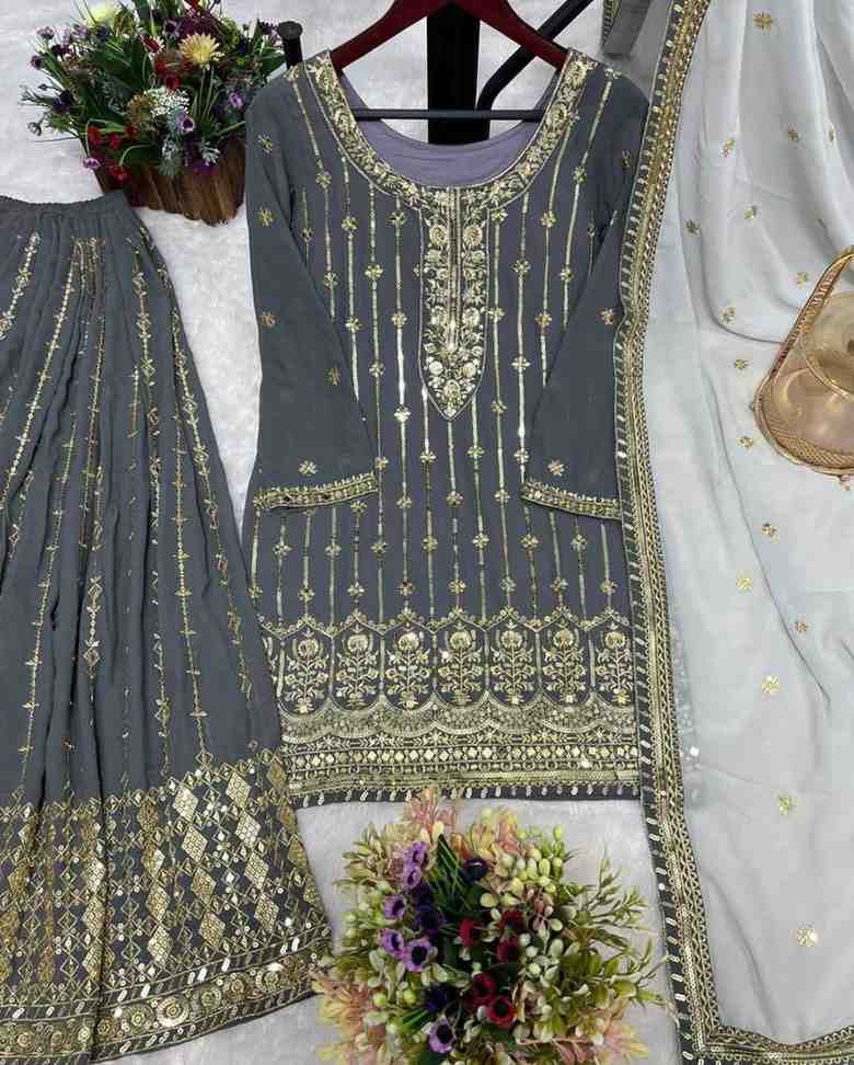 Top : Heavy Faux Georgette With Attractive Embroidery and sequence Work with real mirror hand work (only Front Side Work) , Length : 32-33 inch Palazzo : Heavy Faux Georgette With Beautiful Embroidery and Sequence Work , Inner : Heavy Micro cotton , length : 40-42 inch Dupatta : Heavy Faux Georgette With Embroidery Sequence Work With Lace Border | |