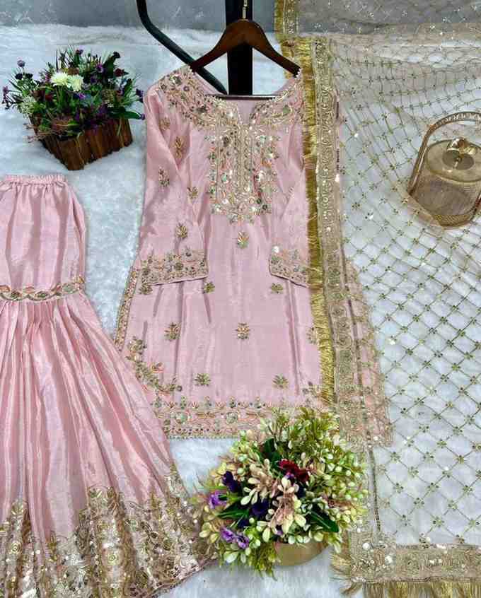 Fabric Type | Kurti :Chinon Silk with Inner-Heavy Micro Cotton, Sharara :Chinon Silk with Inner-Heavy Micro Cotton, Dupatta– Butterfly Net. |