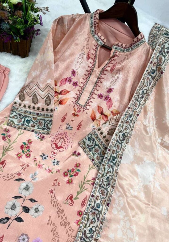 Fabric Type | Top: Chinon Silk With Collar Neck| Inner: Micro Cotton Palazzo: Butter Silk Dupatta: Chinon Silk With Digital Print |