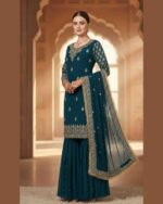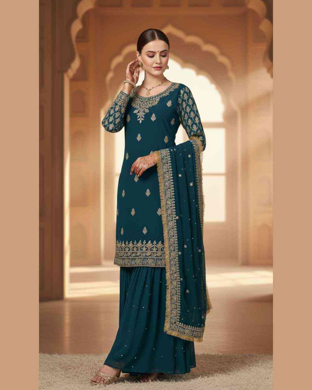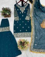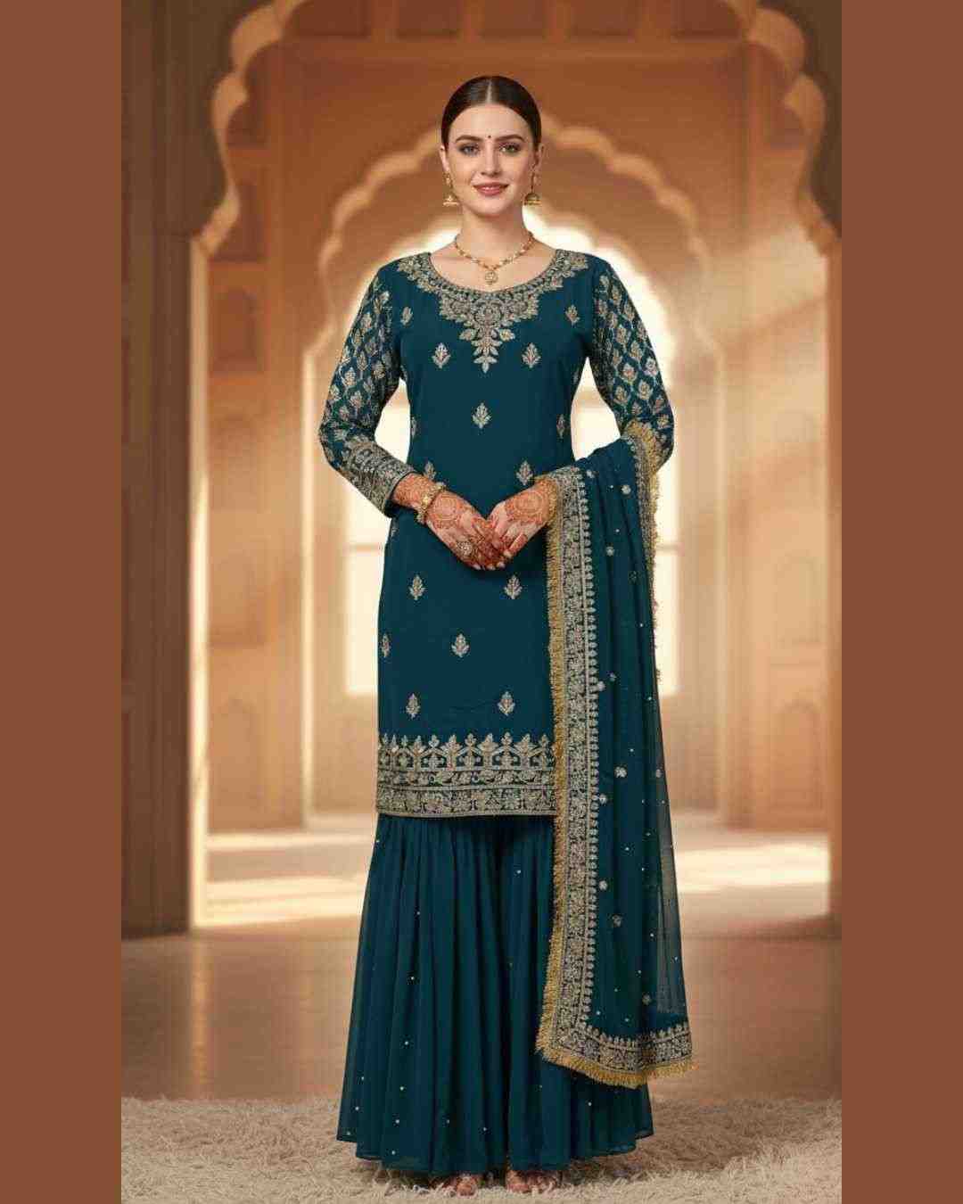 Fabric Type | Top: Heavy Faux Georgette with Beautiful Embroidery Sequence Work , Inner:Heavy Micro Cotton , Length:38-40 Inch Sharara : Heavy Faux Georgette Embroidery Sequence Work And Riveted Moti Work , Inner: Heavy Micro Cotton, Length:42 Inch Dupatta:Heavy Faux Georgette Beautiful Embroidery Sequence Work Lace Border With Riveted Moti And Ready Made Lace Border , Length: 2.10 mtr |