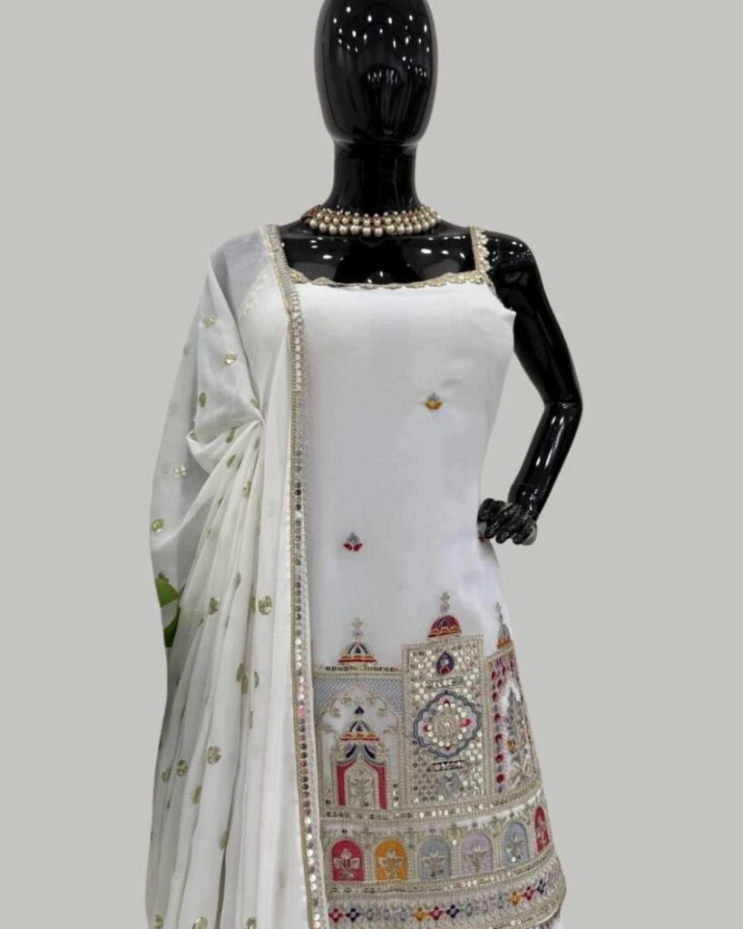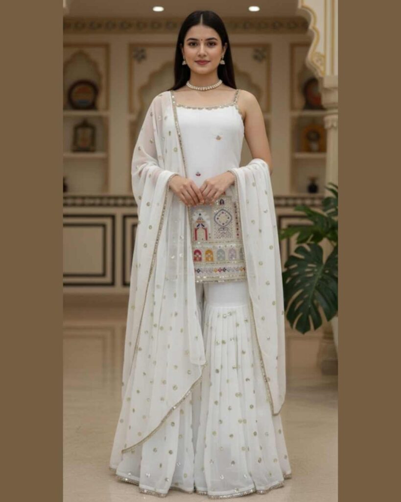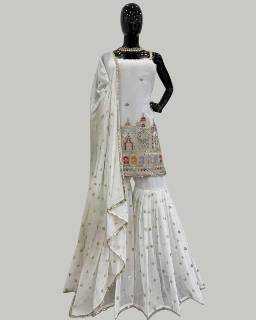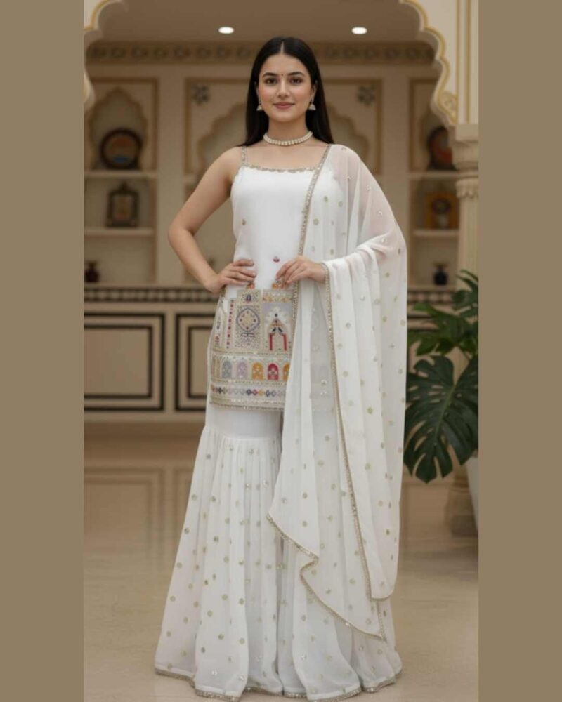 Fabric Type | Suit :Faux Georgette With Inner & Thread & Sequence Work Sharara :Faux Georgette With Sequence Work ,Size Full Stitch With Elastic Dupatta :Faux Georgette And Sequence Work With 4 Side Fancy Lace Border ,Length :2.2 mtr. |