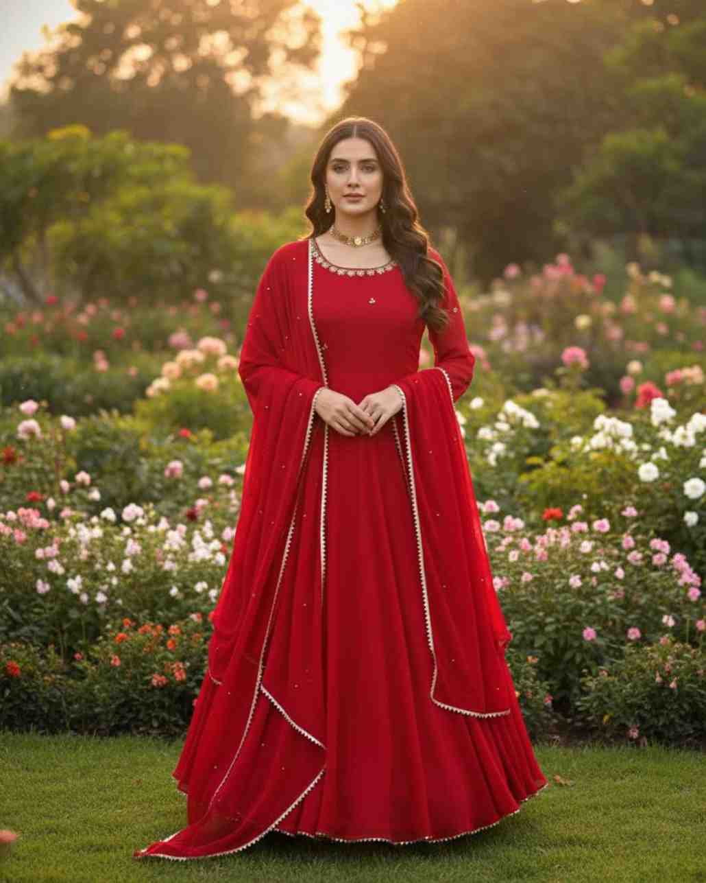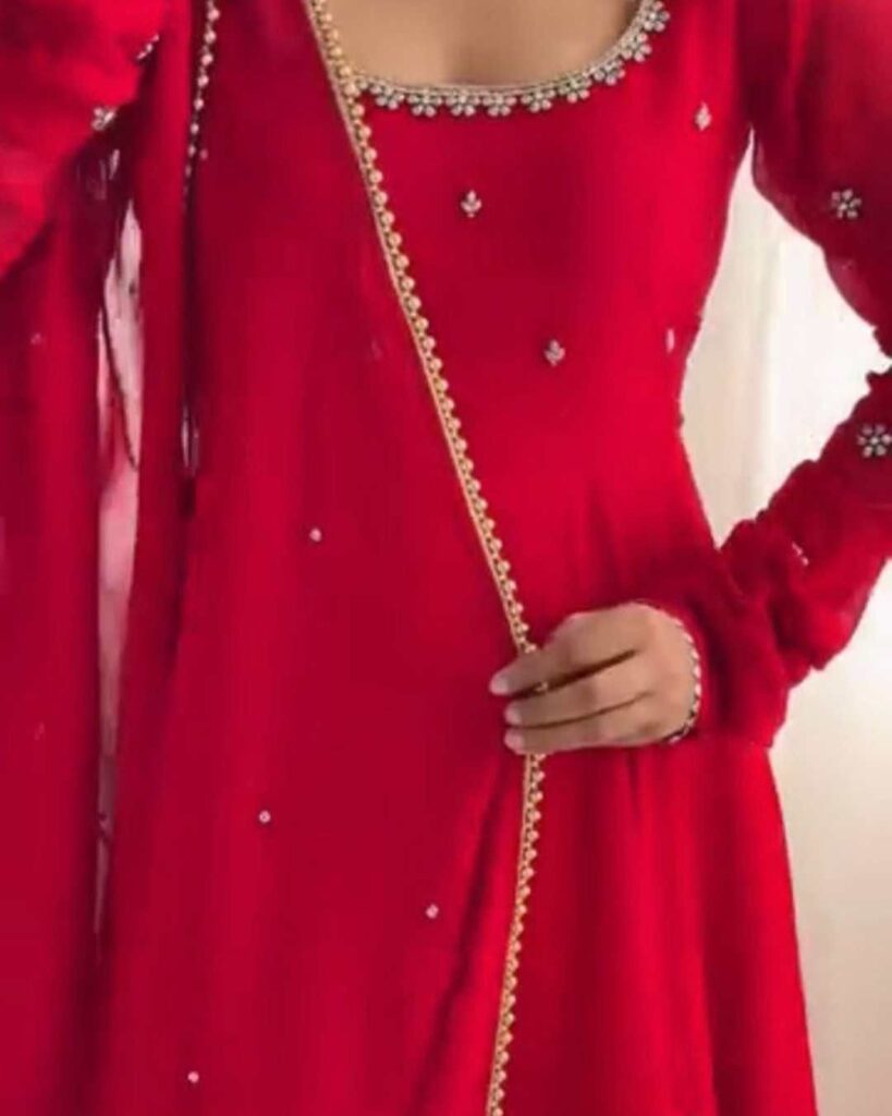 Fabric Type | Top : Faux Georgette with Comfortable inner & Hand work With LCD Stone work & Fancy Lace , Length : 53 Inch, Flair : 4Mtr. Pant :Micro Cotton With Fully stitched ,Length :39 Dupatta : Faux Georgette With Fancy Lace And Moti Work , Length: 2.10 Mtr |