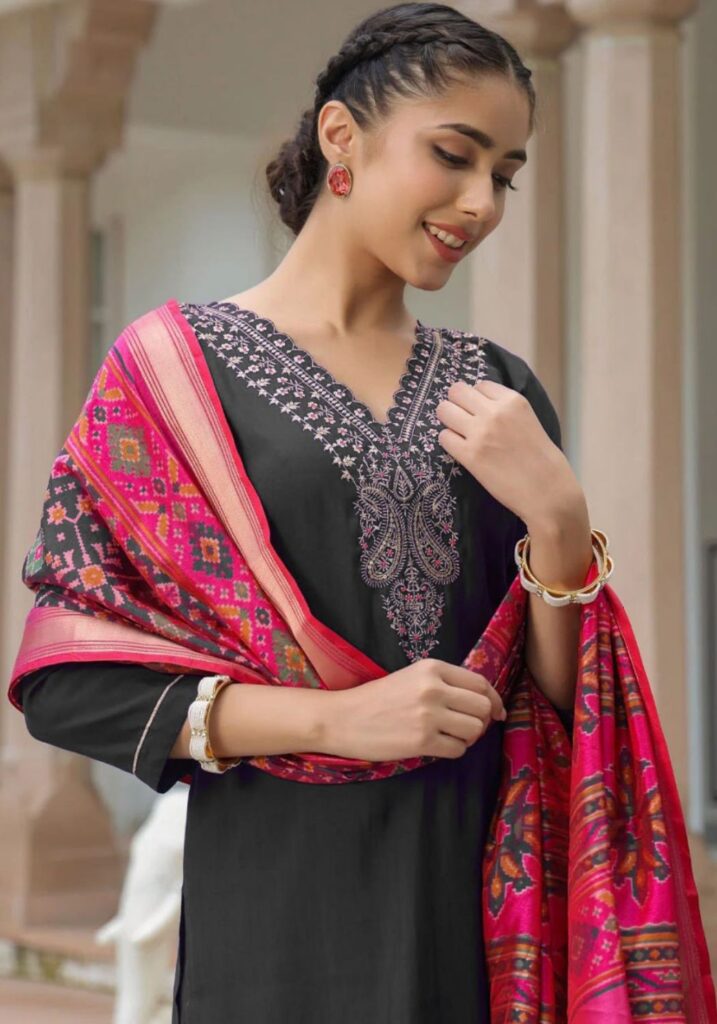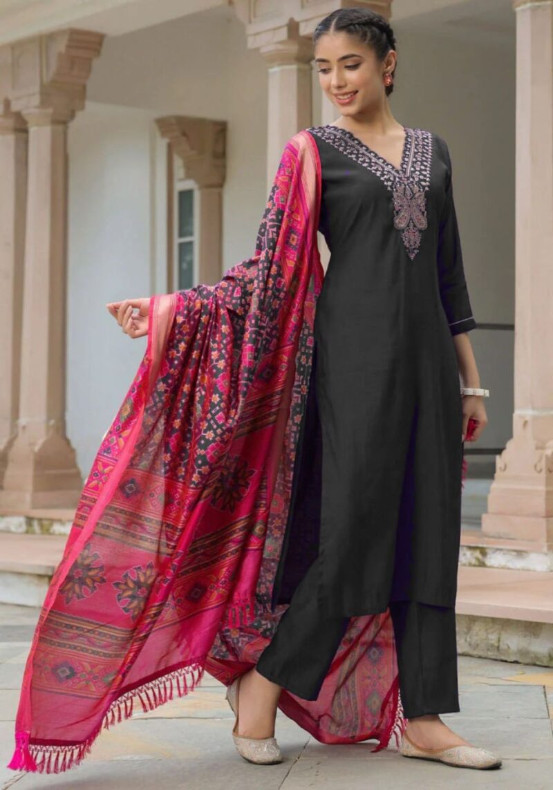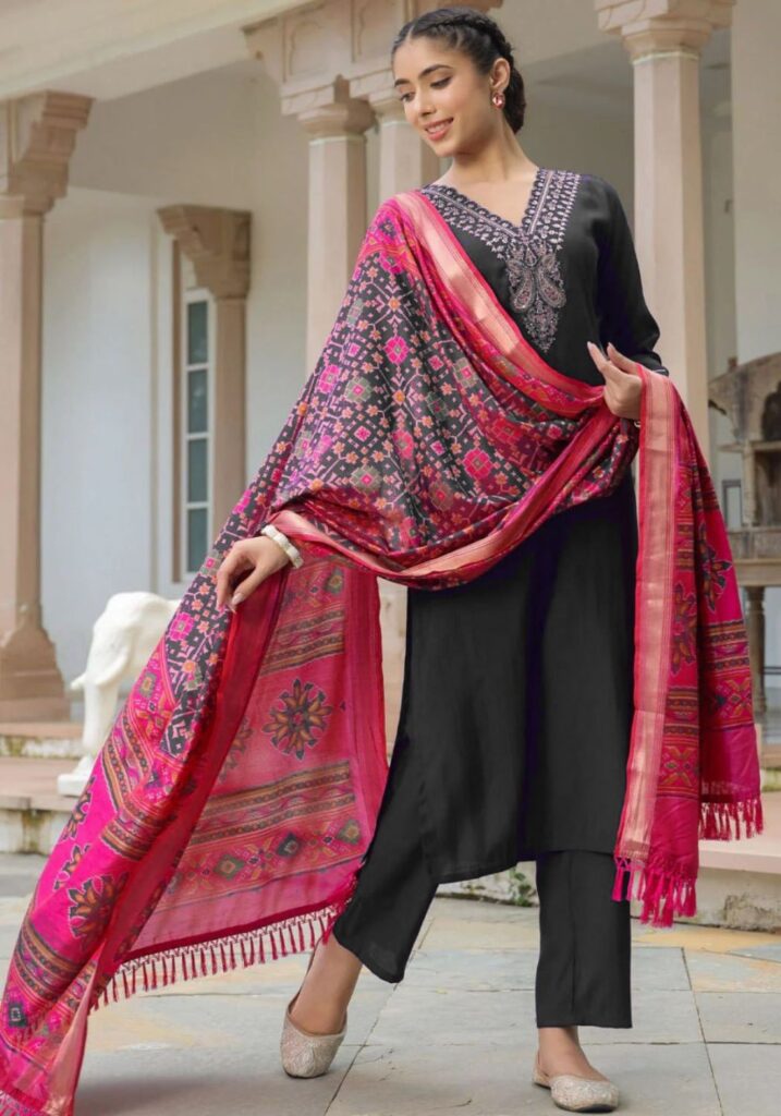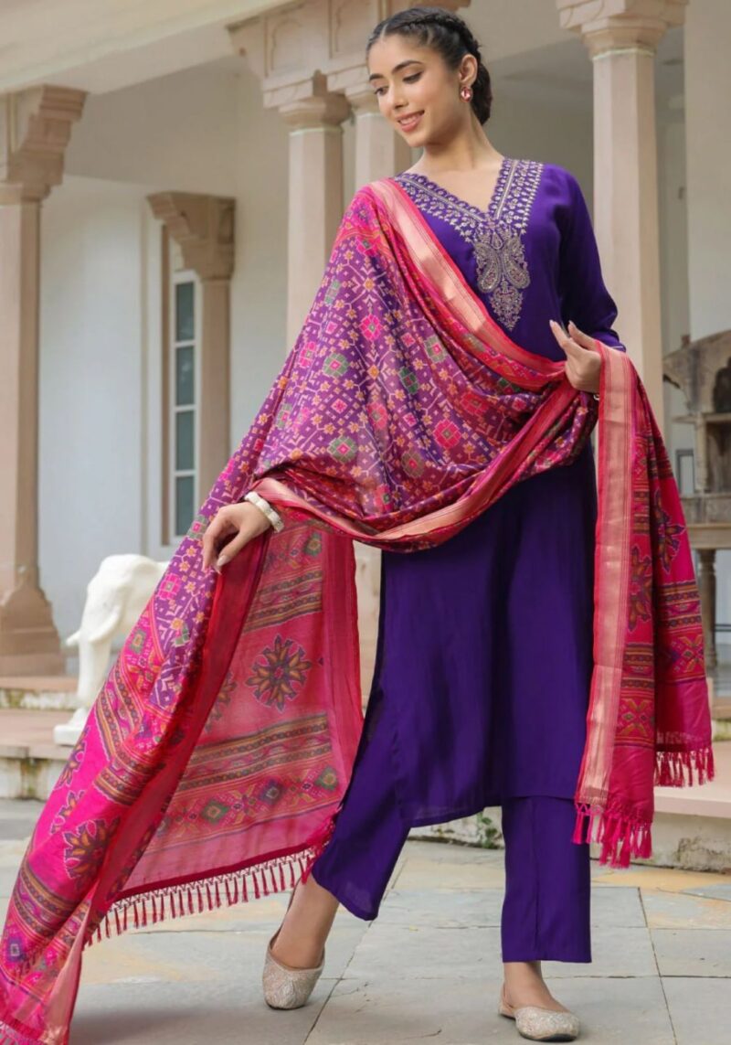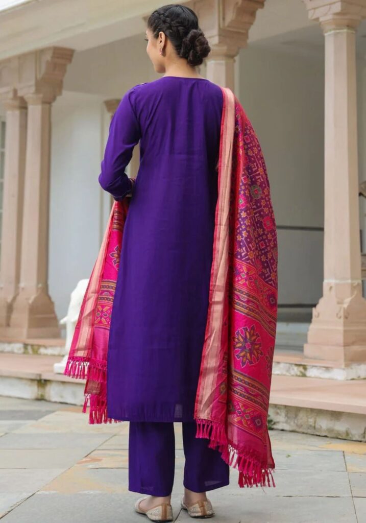 Fabric Detail | Kurta Fabric :- Cotton Blend | Bottom Fabric :- Cotton Blend | Dupatta Fabric :- Chanderi | Sleeve Length :- Three-Quarter Sleeve|Pattern :- Embroidered | Liner:- Micro |