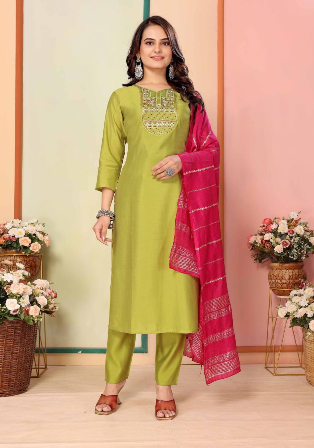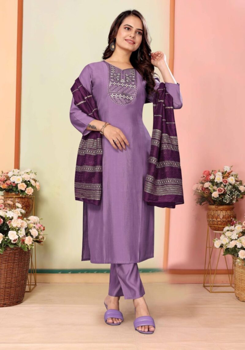 Fabric Detail | Kurta Fabric :- Silk |Bottom Fabric :- Silk |Dupatta Fabric :- Chanderi | Sleeve Length – Three-Quarter Sleeve |