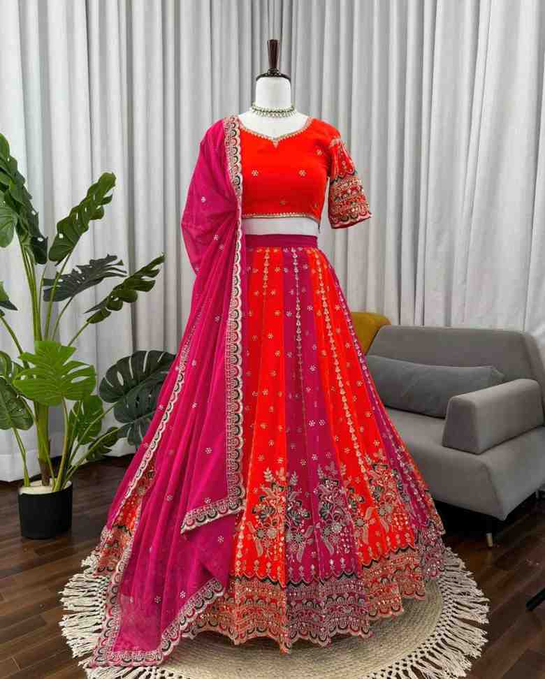 | Fabric Type | Choli: Faux Georgette |Inner: Micro Lining |Size : Upto 42 UnStitch LehengaFaux Georgette |Inner:Soft Micro Lining | Type: Full Stitch & 4 Metre Flair With Canvas Patta And Cancan Dupatta:Faux Georgette & Thread with Sequence with fourside lace border Length :2.2 meter |