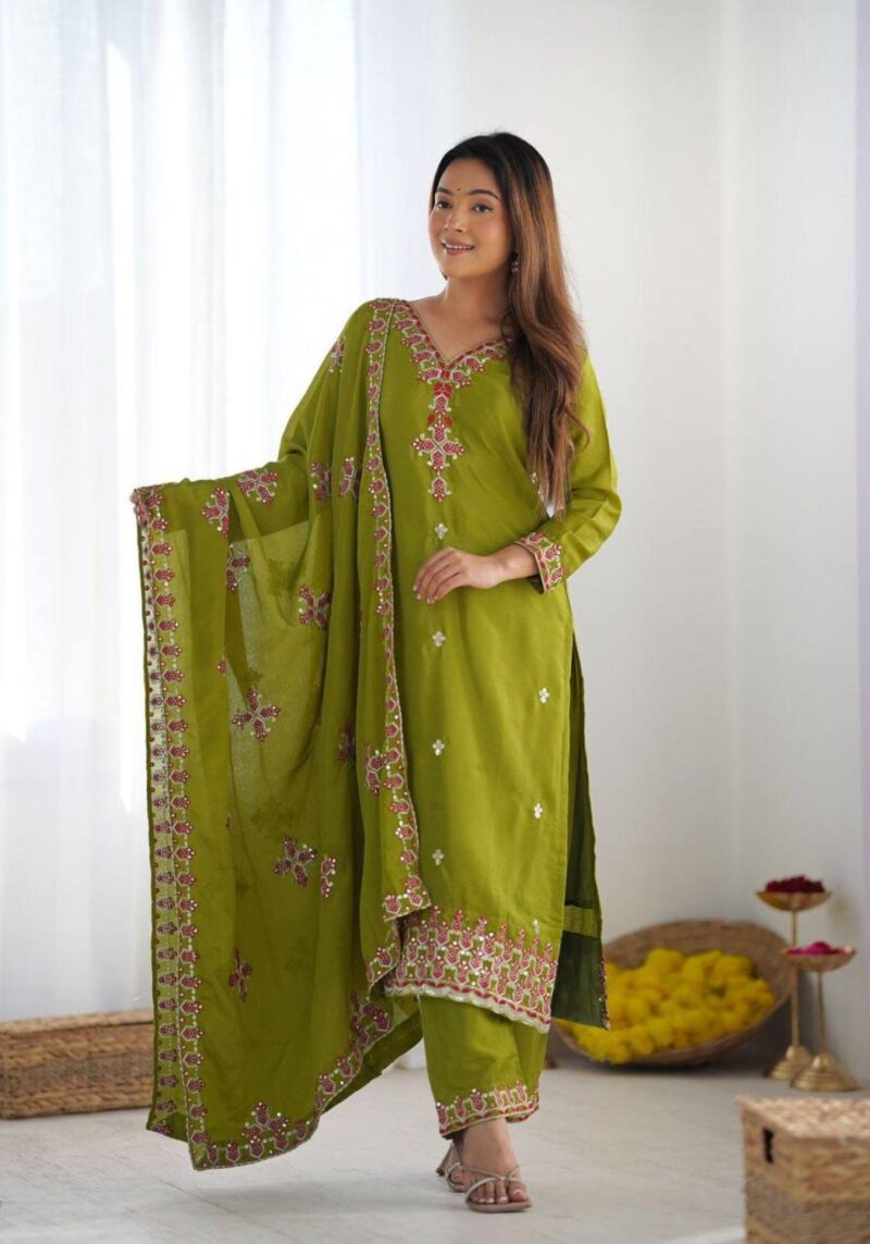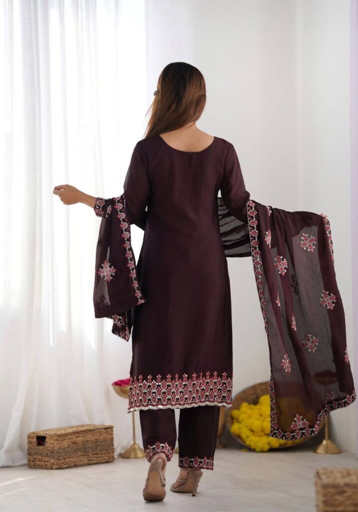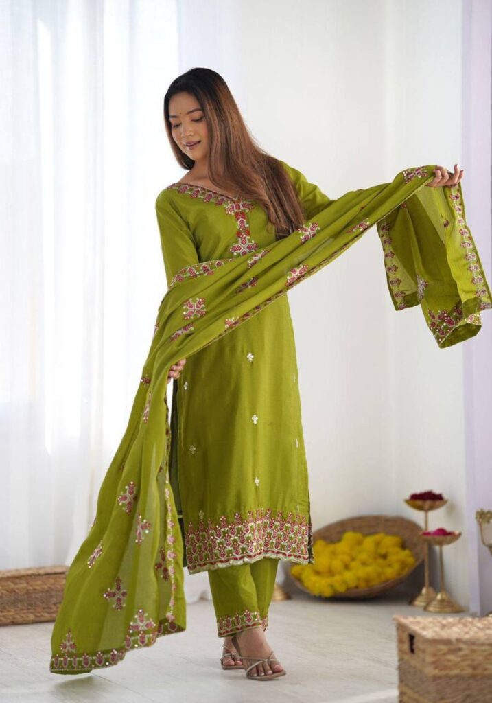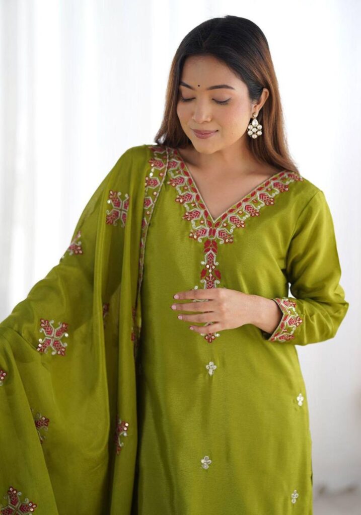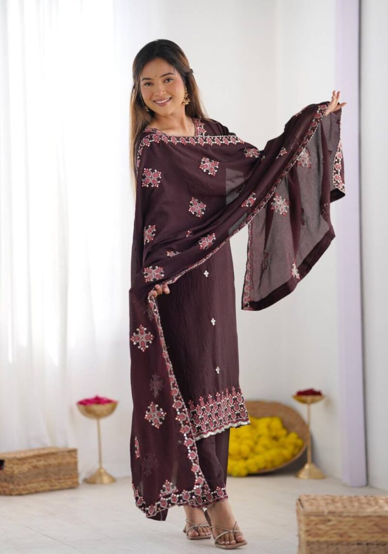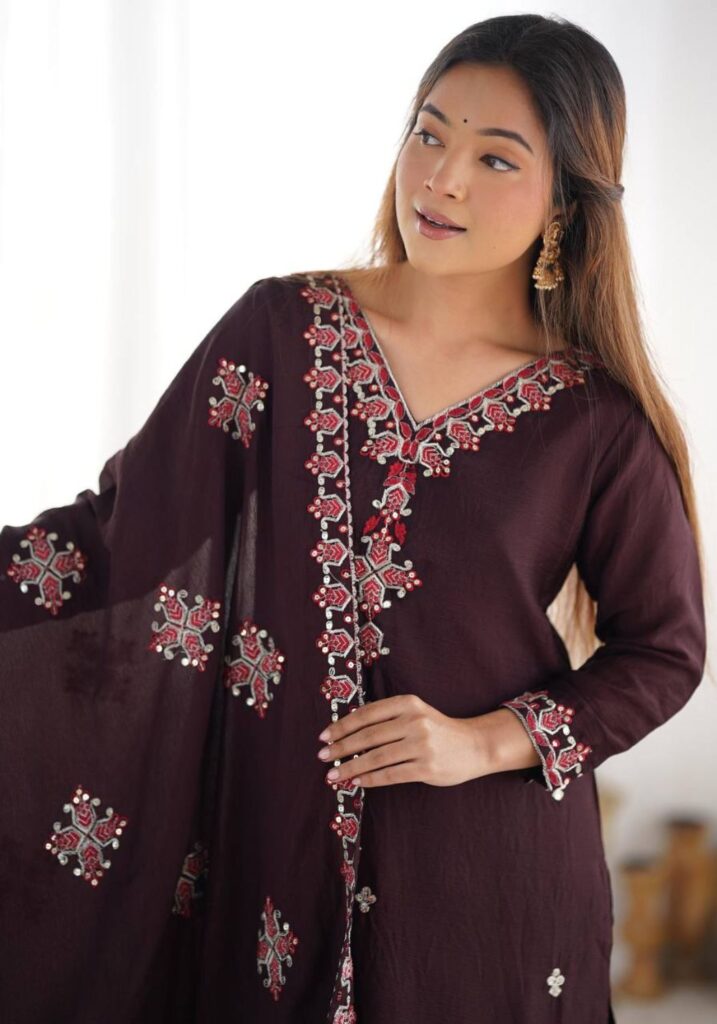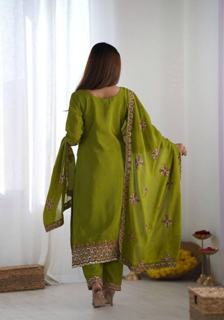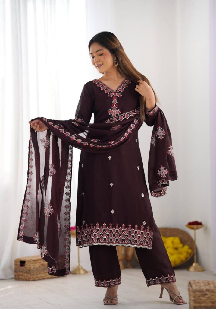 Fabric Type | Top:- *Top Fabric* :Heavy Pure Chinnon Silk With 5mm Embroidery Sequence Work and Heavy Lace Work With Sleeve *Top Inner* :Heavy Micro Cotton *Top Length* : 45 inches , Bottom:- *Bottom Fabrics* :Heavy Pure Chinnon Silk With 5mm Embroidery Sequence *Bottom inner* :Heavy Micro Cotton *Bottom Length*:40-41 Inch *(fully stitched)*, Dupatta:- *Dupatta Fabric* :Heavy Pure Chinnon Silk With Heavy Embroidery Sequence Work *Dupatta Length*: 2.10MTR |