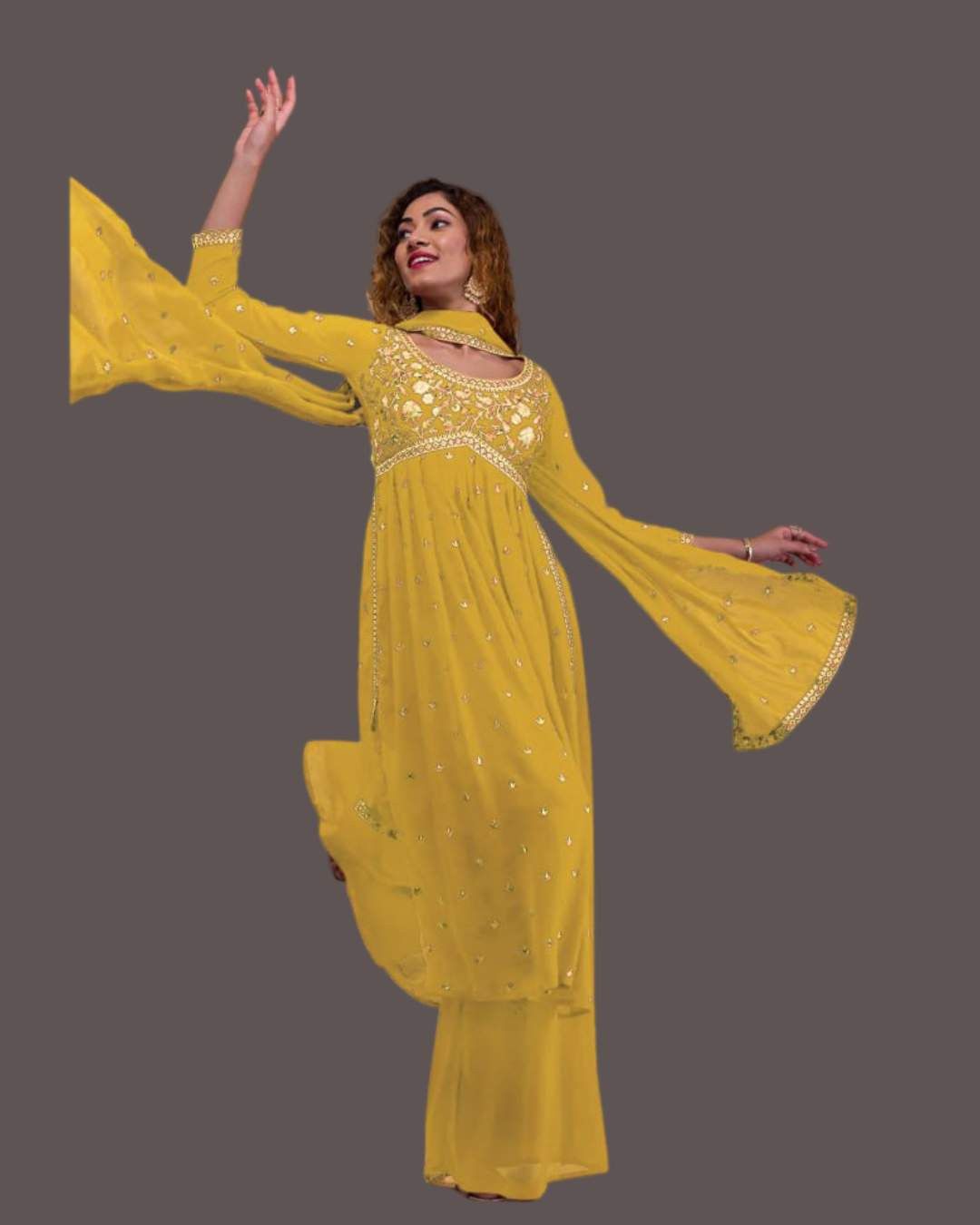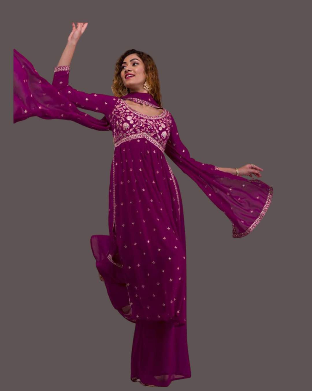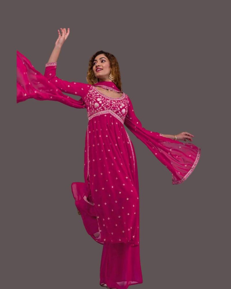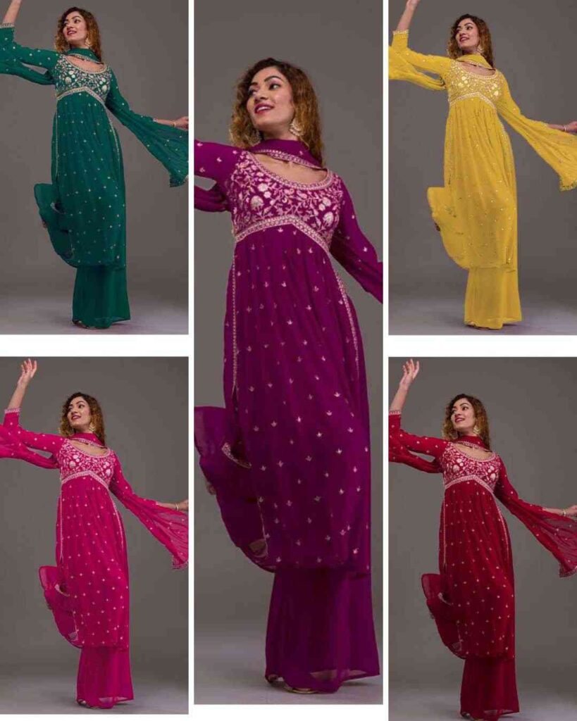 Fabric Type | Top: Heavy Georgette With Sequence Embroidery Work ,Sleeve:- Georgette With Sequence Embroidery Work ,Inner: Crap , Length: 52 Inch Bottom: Heavy Georgette With Crap Inner , Size :Fully Stitched 44 inch Max , length:42 Inch Dupatta: Heavy Georgette With Sequences Embroidery Work and 4 Side Lace , Type: Fully Stitched WASH:- First Time Dry Clean |