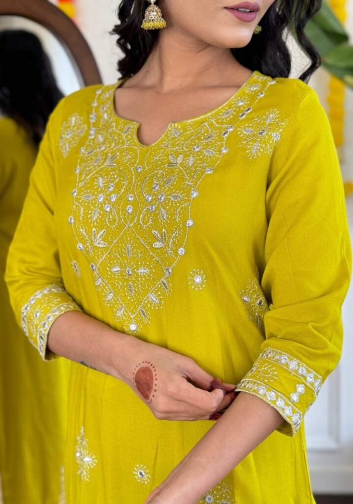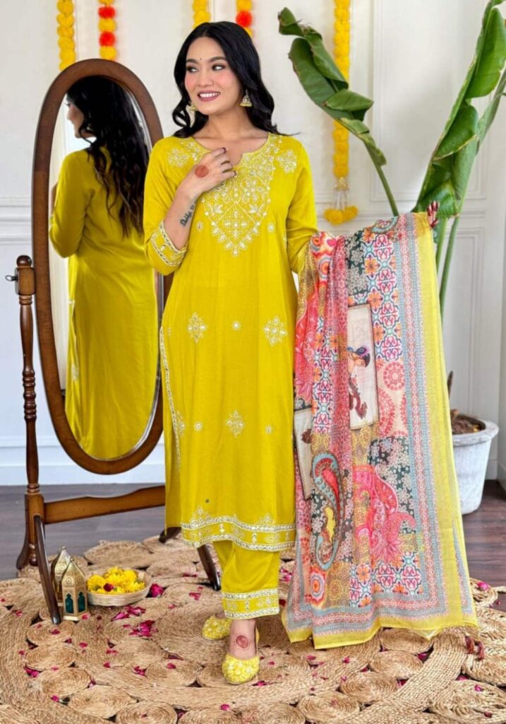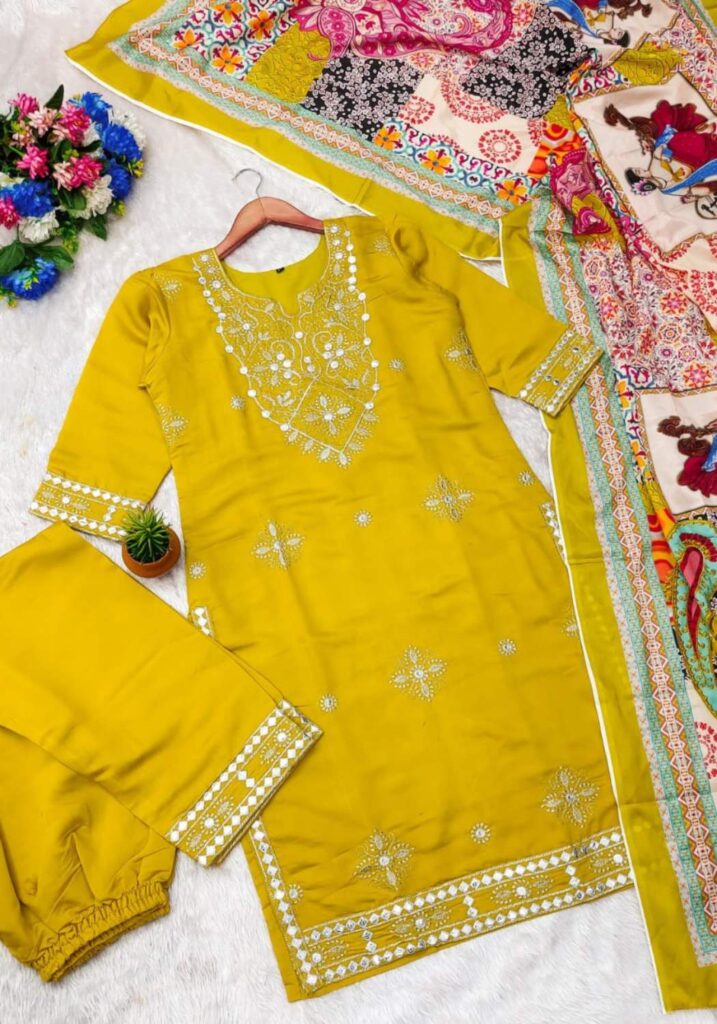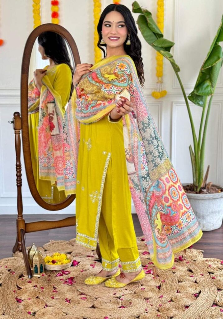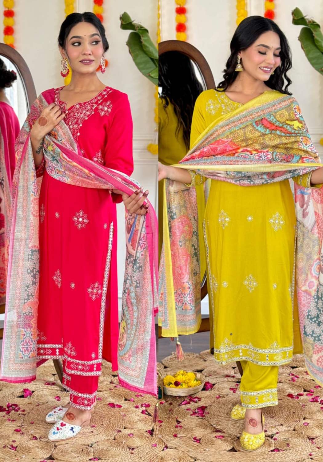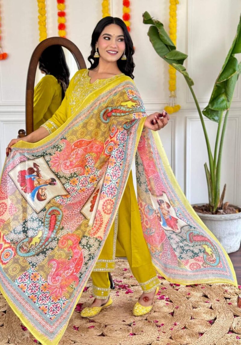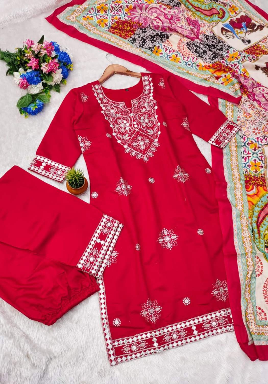 Fabric Type | Top: Heavy Cotton With Embroidery GotaPati Work With Full Sleeves |Top Inner: Heavy Cotton| Top Length: 45-46 Inch | Bottom: Heavy Cotton Pent |Bottom length:40-41 Inch | Dupatta: Heavy Chinon Silk With Digital Print Work| Type: Fully Stitched |