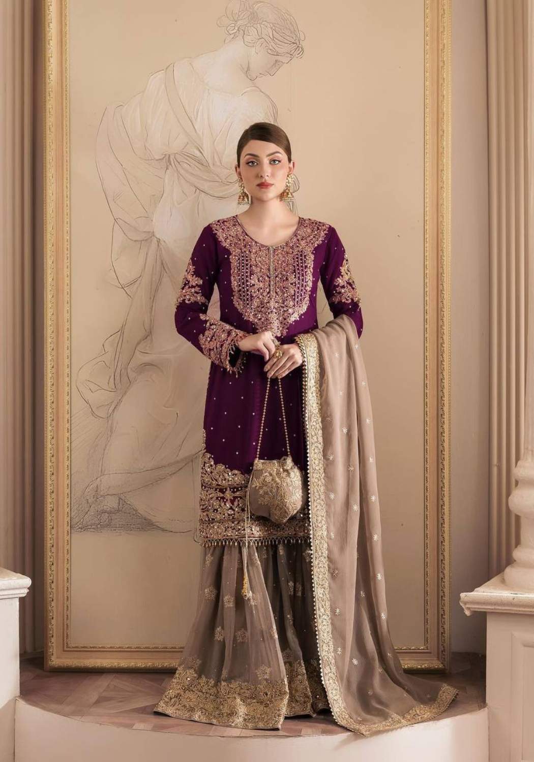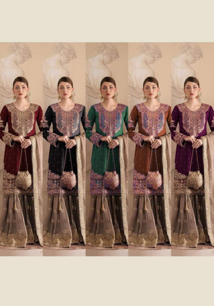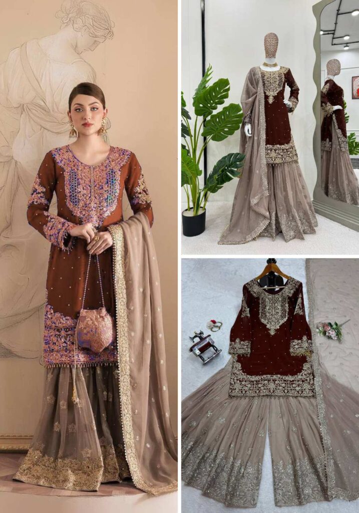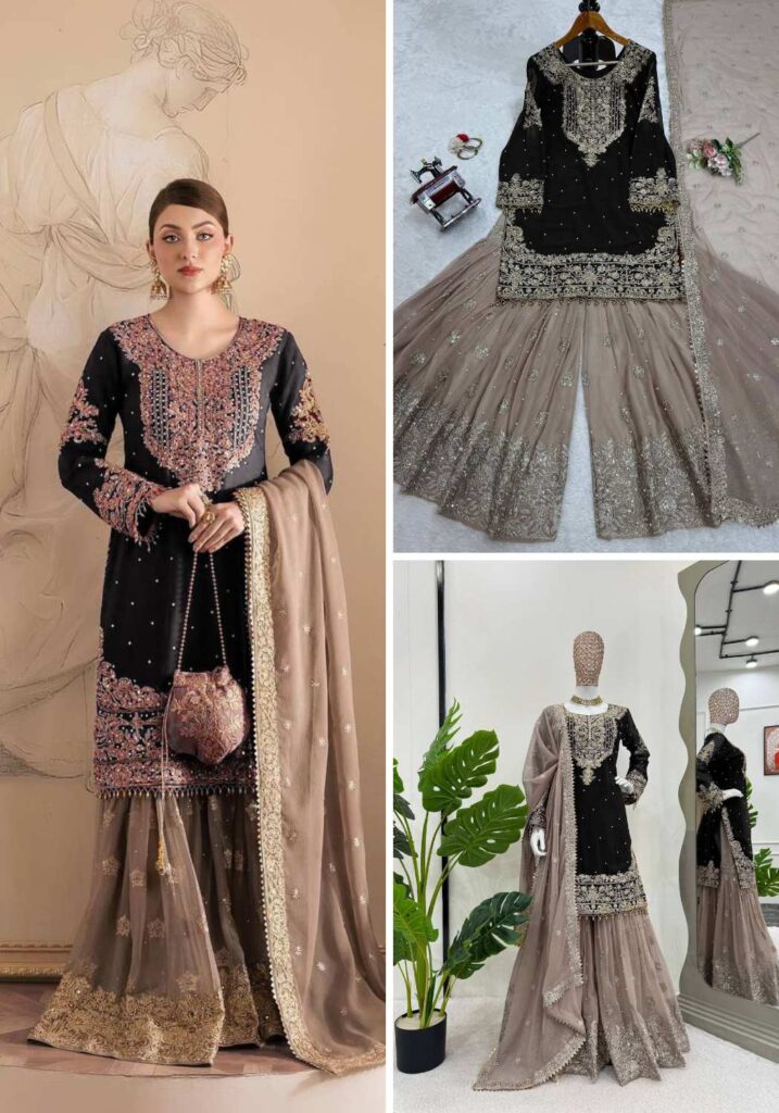 YD-014 Pure Chinon Silk With Fancy Embroidery Sharara Dupatta