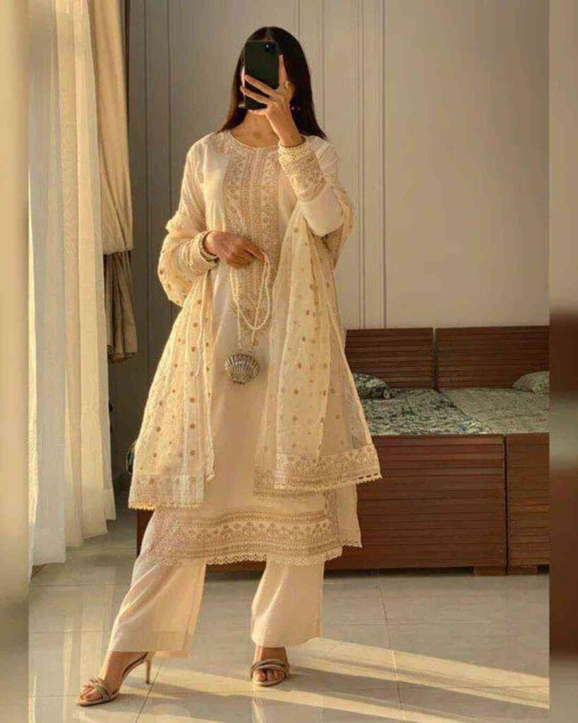 Fabric Type | Top: Heavy Soft Chanderi Silk With Embroidery Sequence Work. , Inner: Heavy Cotton , Length: 44-45 Inch Bottom: Heavy Chanderi Silk Cotton With Elastic , length:41 Inch Dupatta: Heavy Organza silk With Embroidery Sequence Work With Lec., Type: Fully Stitched |