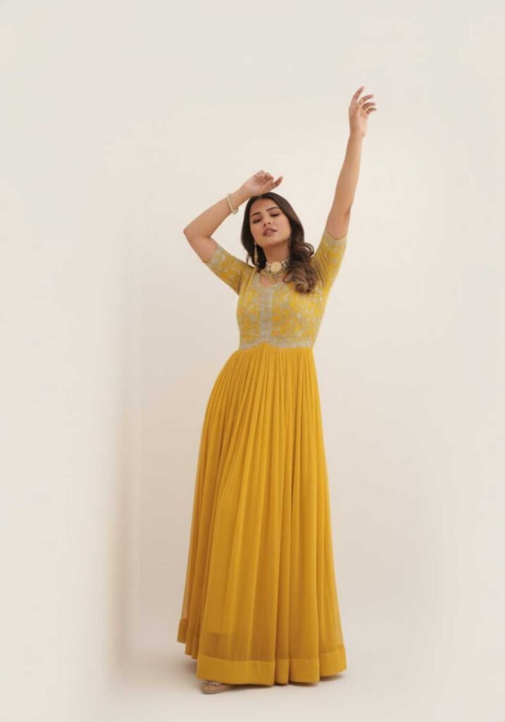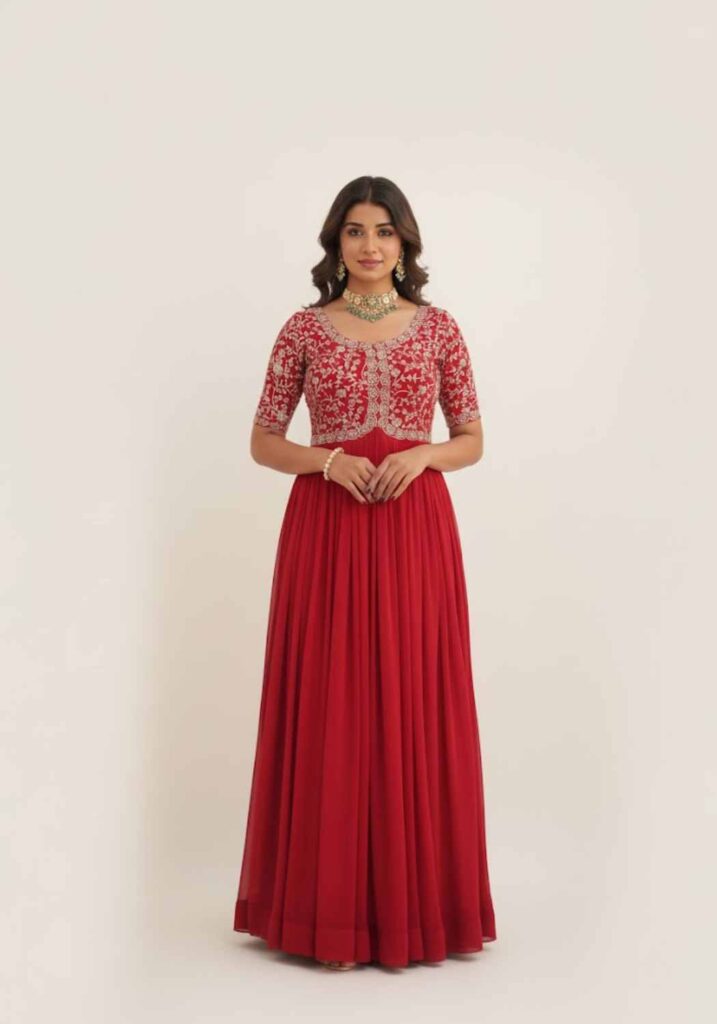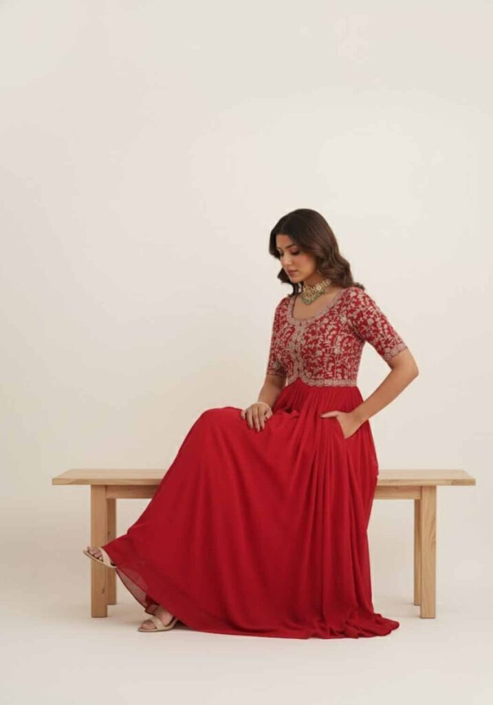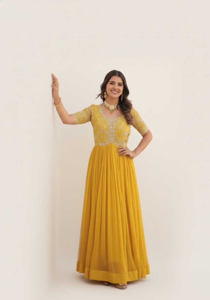 Elevate your festive wardrobe with our spectacular gown, featuring a full, flowing skirt crafted from luxurious Faux Blooming fabric. The true statement piece is the intricate bodice, lavishly adorned with detailed Zari and Sequins Work. Available in three breathtaking shades—Passionate Red, Vibrant Mustard Yellow, and Deep Teal—this gown ensures you shine at every special occasion. Experience comfort, flow, and unmatched elegance.